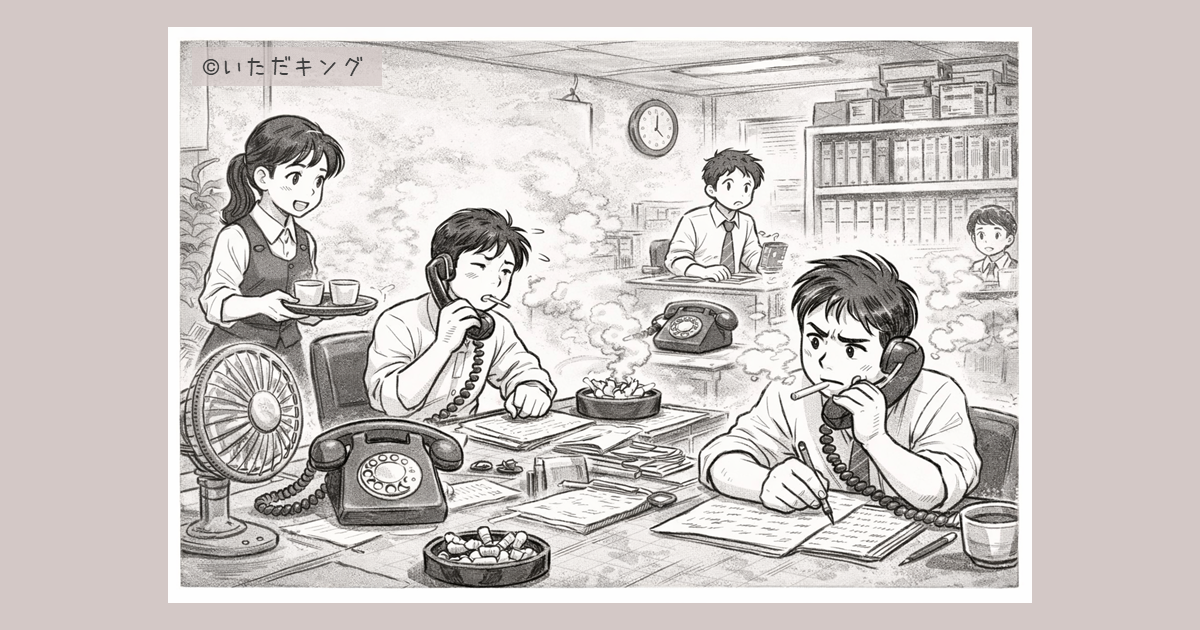 机の上の黒電話と灰皿。今のオフィスではすっかり姿を消しましたが、昭和を知る世代にはたまらないディテールです。制服でお茶を配る女子社員。この「当たり前だった昭和」が、いま見ると最高にシュール。そして最後に残るのは、部長のひと言。