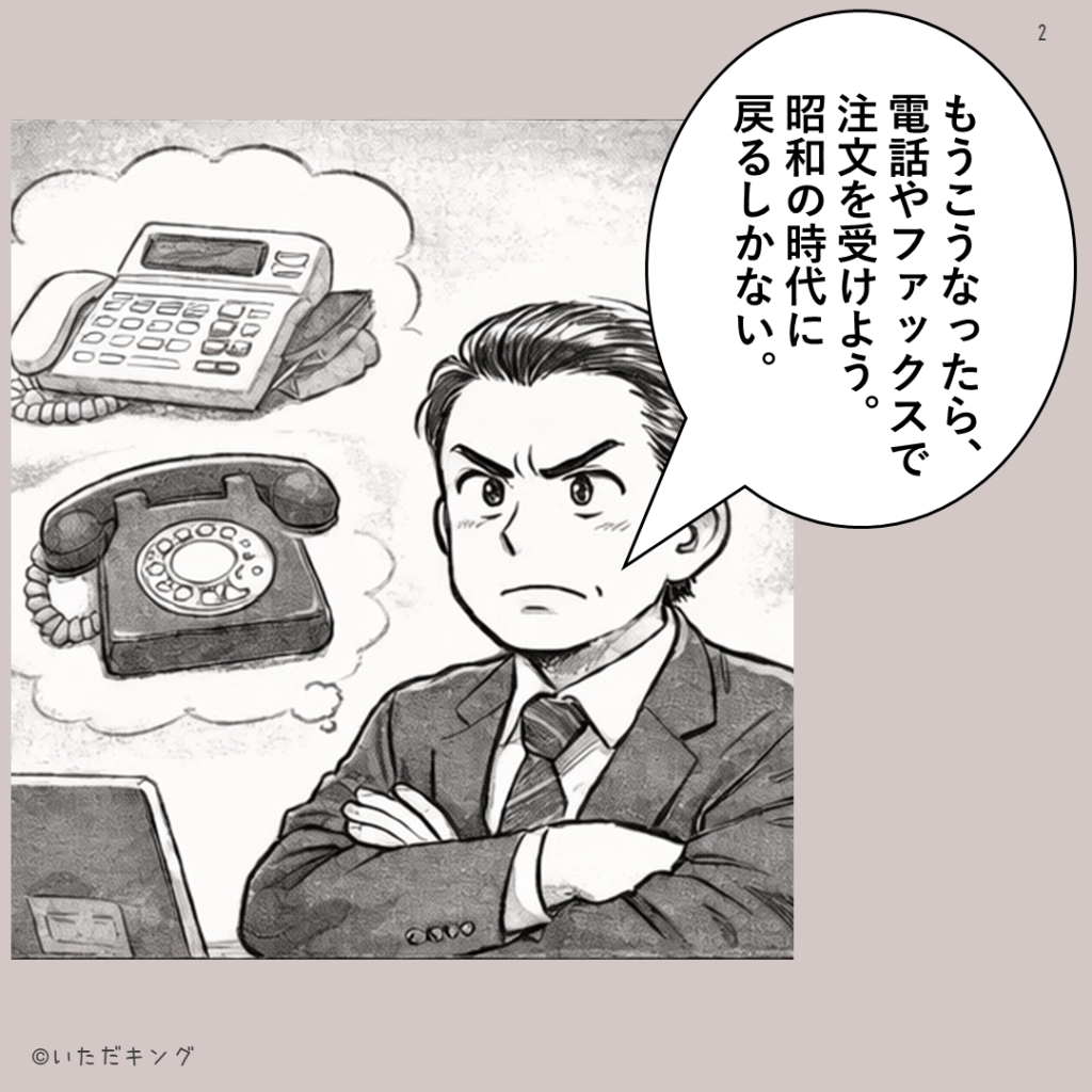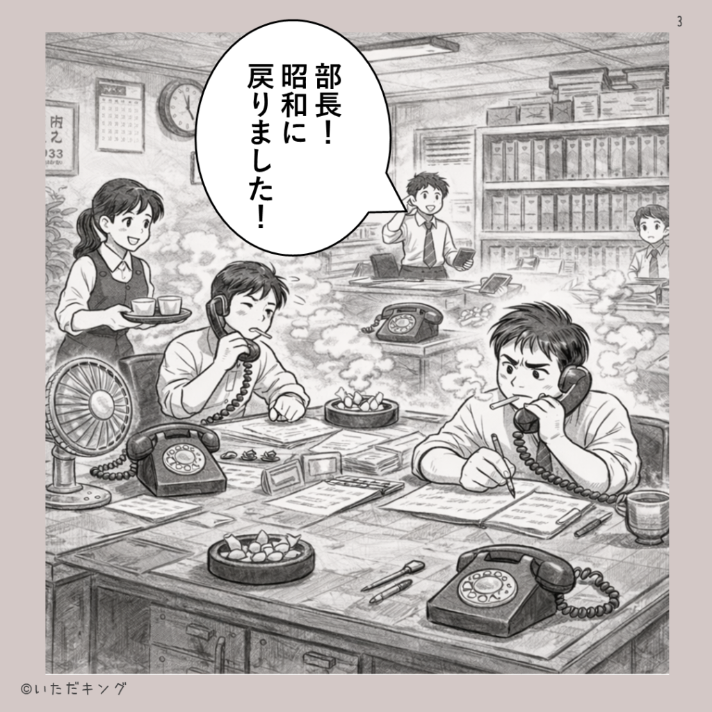 システムダウンという絶望的な状況で、部長が下した「昭和に戻る」という決断。しかし、3コマ目の現場再現度は、もはやシステム復旧を超えた「タイムスリップ」状態です(笑)。